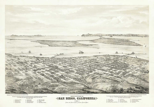 Mapa antiguo raro de San Diego por Eli Sheldon Glover, 1876: Ojo de aves, Downtown Oldtown, East Village, Cortez Hill
