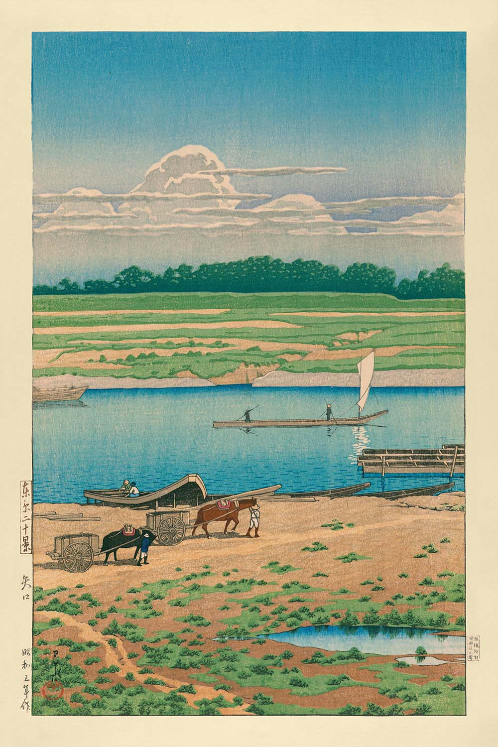 Barco de vela en el río y caballos de Hasui Kawase, 1935