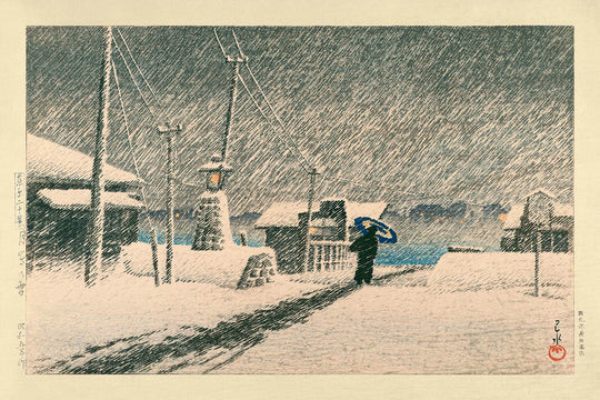 Tormenta de Nieve en Tsukishima de Hasui Kawase, creada en 1935, es una impresionante impresión en madera que captura la serena elegancia de un invierno japonés. Hasui Kawase, una figura prominente en el movimiento Shin-Hanga, es celebrado por revitalizar el ukiyo-e tradicional con una sensibilidad moderna, fusionando temas japoneses con influencias occidentales de luz y perspectiva.