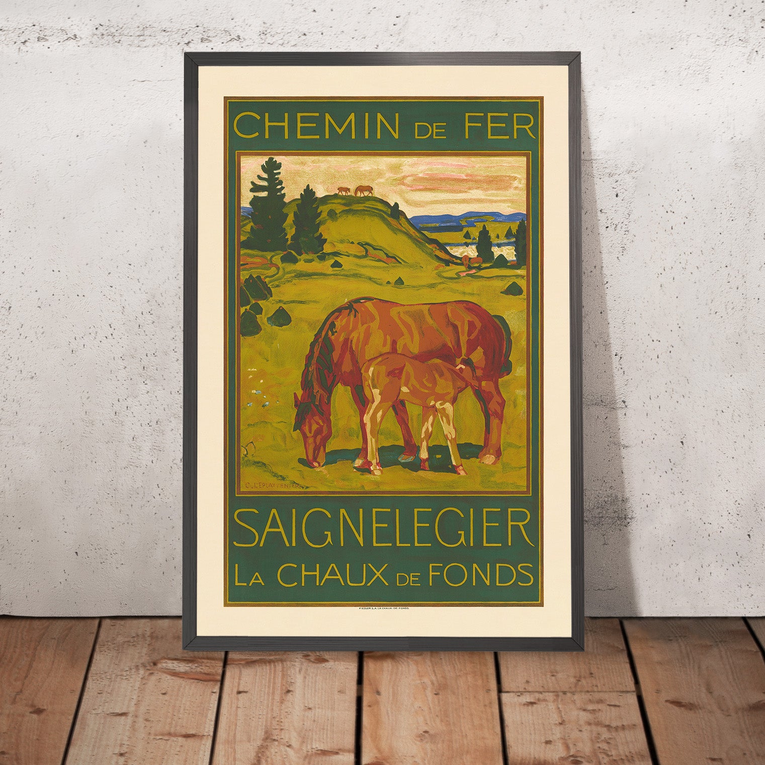 The route itself is a storied one: a link between Saignelégier in the Franches-Montagnes—known for its high plateau and sweeping, tree-dotted pastures—and La Chaux-de-Fonds, a city synonymous with precision watchmaking and design. This poster distills that journey into a lyrical geography: rolling Jura contours, staccato ranks of firs, and a clear, beckoning atmosphere that evokes the cool, resin-scented air of the heights. For those who have traced this line by rail or road, the names Saignelégier and La Chaux-de-Fonds conjure purposeful travel, fine craft, and the quiet drama of the Swiss borderland.
