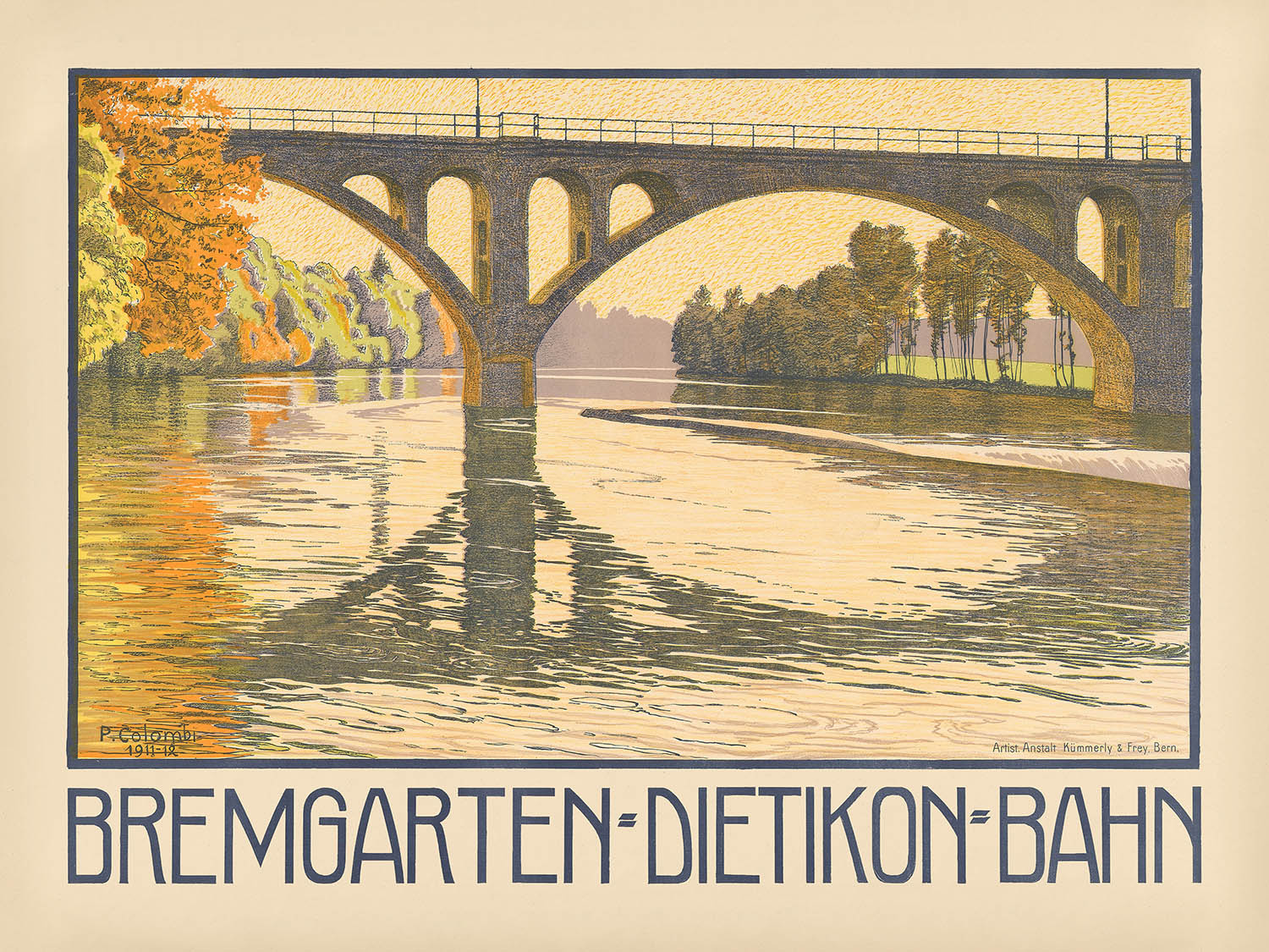 This particular poster reflects the optimism of Swiss regional rail in the early 20th century, when lines like the Bremgarten–Dietikon route connected historic market towns with the growing orbit of Zürich. Rather than depicting locomotives, Colombi focuses on place: the graceful infrastructure and tranquil river landscape that passengers would remember from their journey. It is both an advertisement and a love letter to a region where bridges, water, and wooded banks define the view.