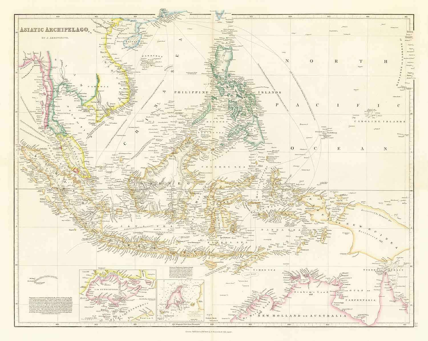 Antiguo mapa del archipiélago malayo y de las Indias Orientales de Arrowsmith, 1859: Sudeste asiático, Filipinas, Islas, Estrecho, Singapur