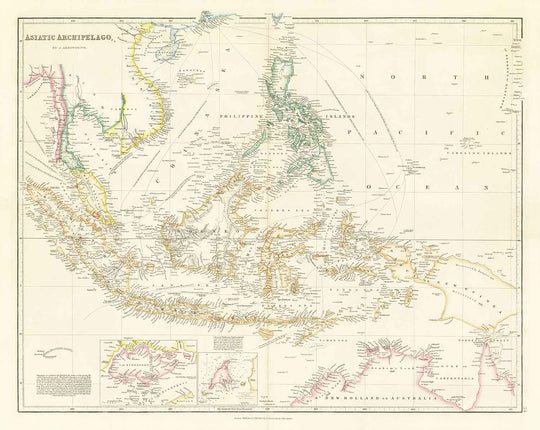 Un hermoso mapa de las Indias Orientales y el Archipiélago Malayo, publicado originalmente en 1859 por probablemente el cartógrafo más buscado de mediados del siglo XIX, John Arrowsmith.