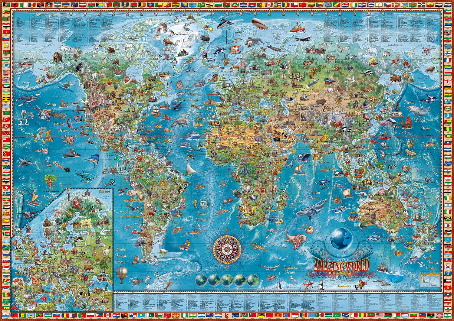 - Importancia histórica o contexto del mapa: Representa una interpretación moderna de la geografía mundial con un enfoque en el atractivo educativo y visual para los niños.