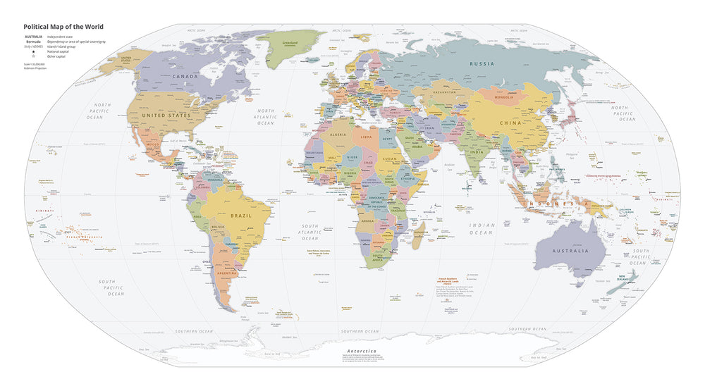 Mapa Mundial Moderno: Fronteras Políticas, Proyección de Robinson, Capitales y Ciudades Principales