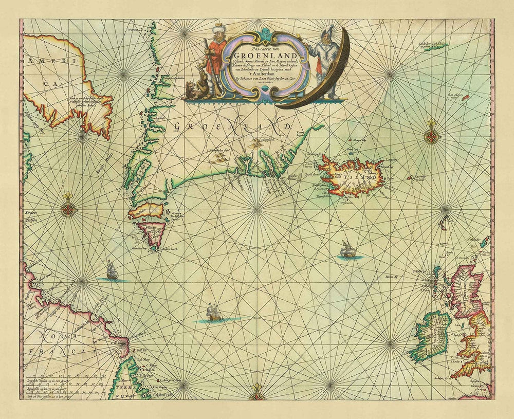 Mapa antiguo de Groenlandia, Islandia y el Mar del Norte, 1661 por van Loon: Carta de exploración vikinga
