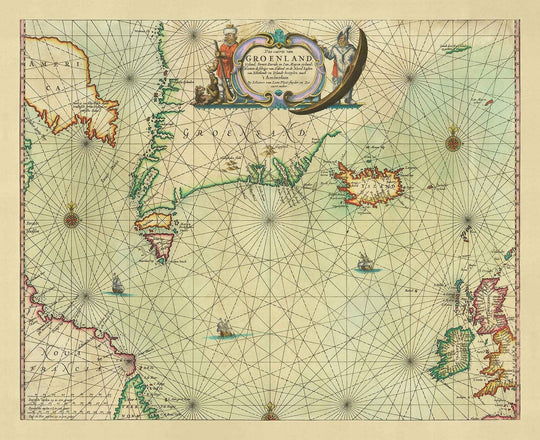 Un mapa encantador de Groenlandia, Islandia y el Mar del Norte, con apariciones de las Islas Británicas y Canadá (entonces Nueva Francia) en los bordes del mapa. Publicado originalmente en 1661 por el maestro cartógrafo holandés Johannes van Loon, este es uno de los mapas más precisos (y raros) de la región. Se habría utilizado por los marineros para navegar de manera segura a través del Mar del Norte hacia el Nuevo Mundo.