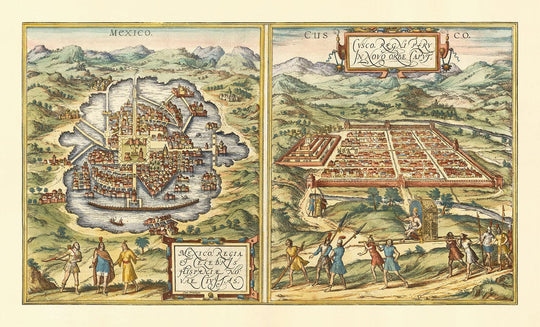 Mapa antiguo de México Ciudad y Cusco, 1572 de Georg Braun: Aztec, Perú, Texcoco, Tenochtitlan, Colonialismo español