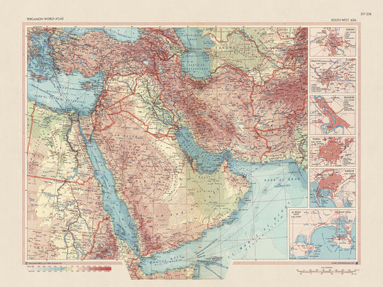 Este mapa de Asia del Suroeste, publicado originalmente en 1967 por el Servicio de Topografía del Ejército Polaco, es un mapa político y físico detallado que proporciona una visión completa de la región. El mapa abarca una vasta área geográfica, que incluye la totalidad del Medio Oriente, así como partes de Europa, Asia y África. Este amplio alcance lo convierte en un recurso invaluable para comprender el paisaje geopolítico de la región durante mediados del siglo XX.
