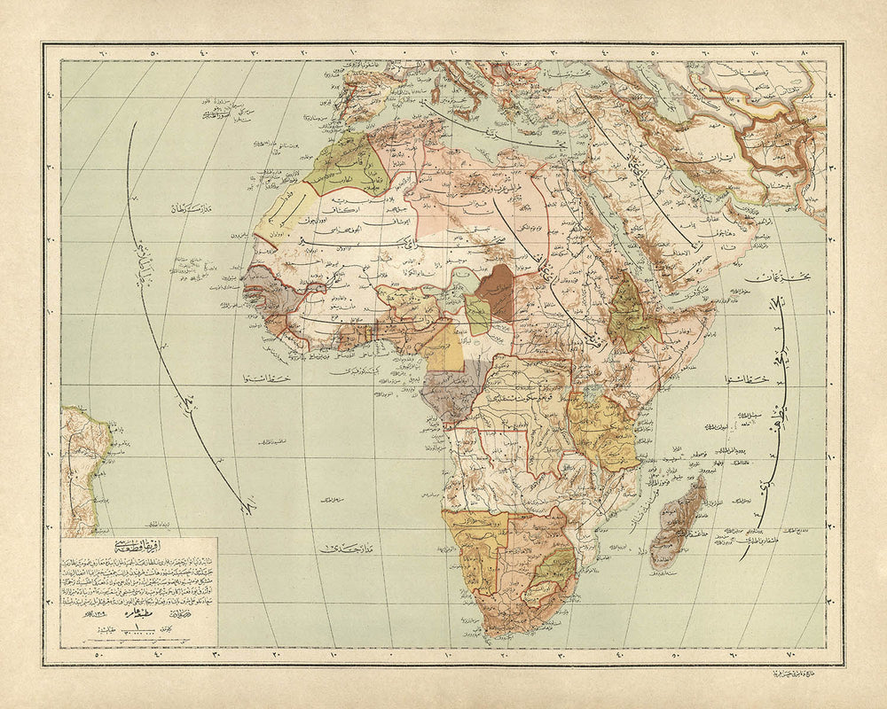 Adéntrate en el rico tapiz de la historia con el "Afrika Kıtasını," un cautivador mapa del estimado Nuevo Atlas Geográfico del Mundo. Elaborado entre 1893 y 1898 por el renombrado cartógrafo Hafız Ali Eşref, este mapa ofrece una visión única del mundo a finales del siglo XIX a través del lente del arte otomano. Eşref, formado en París y luego sirviendo como el cartógrafo jefe en la Imprenta Matbaa-i Amire, impregnó esta obra con una meticulosa atención al detalle, convirtiéndola en una verdadera obra maestra de su tiempo.