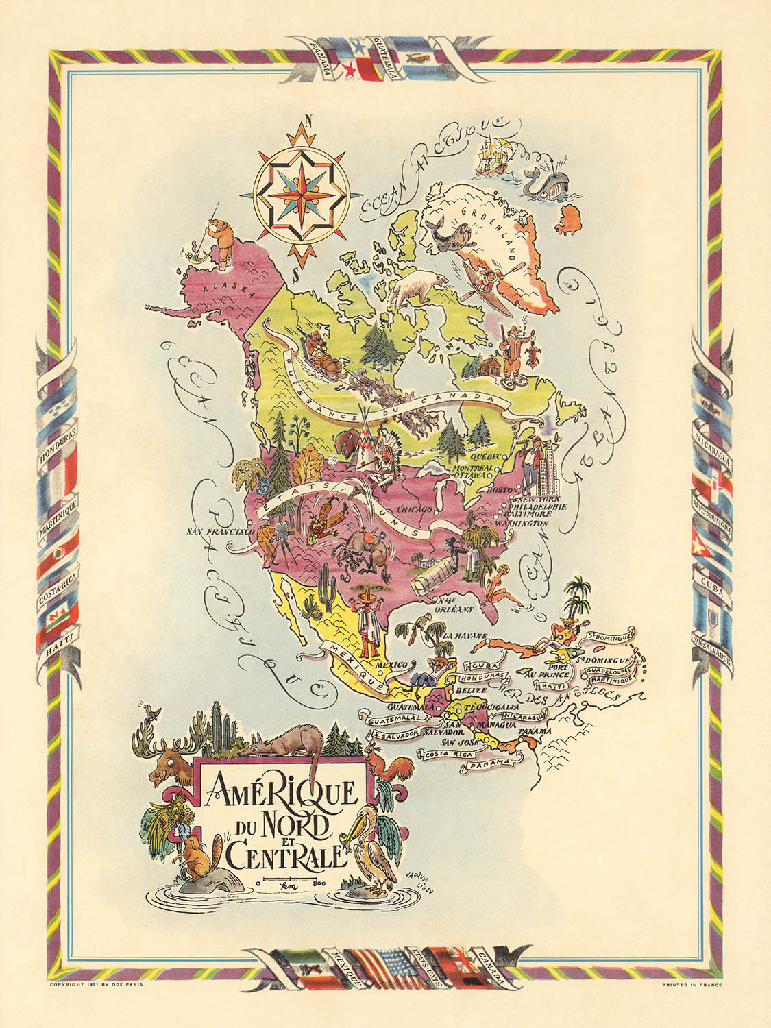 Antigua Mapa Pictórico de América del Norte y Central por Liozu, 1951: Ciudades Principales, Vida Silvestre, EE. UU., Caribe