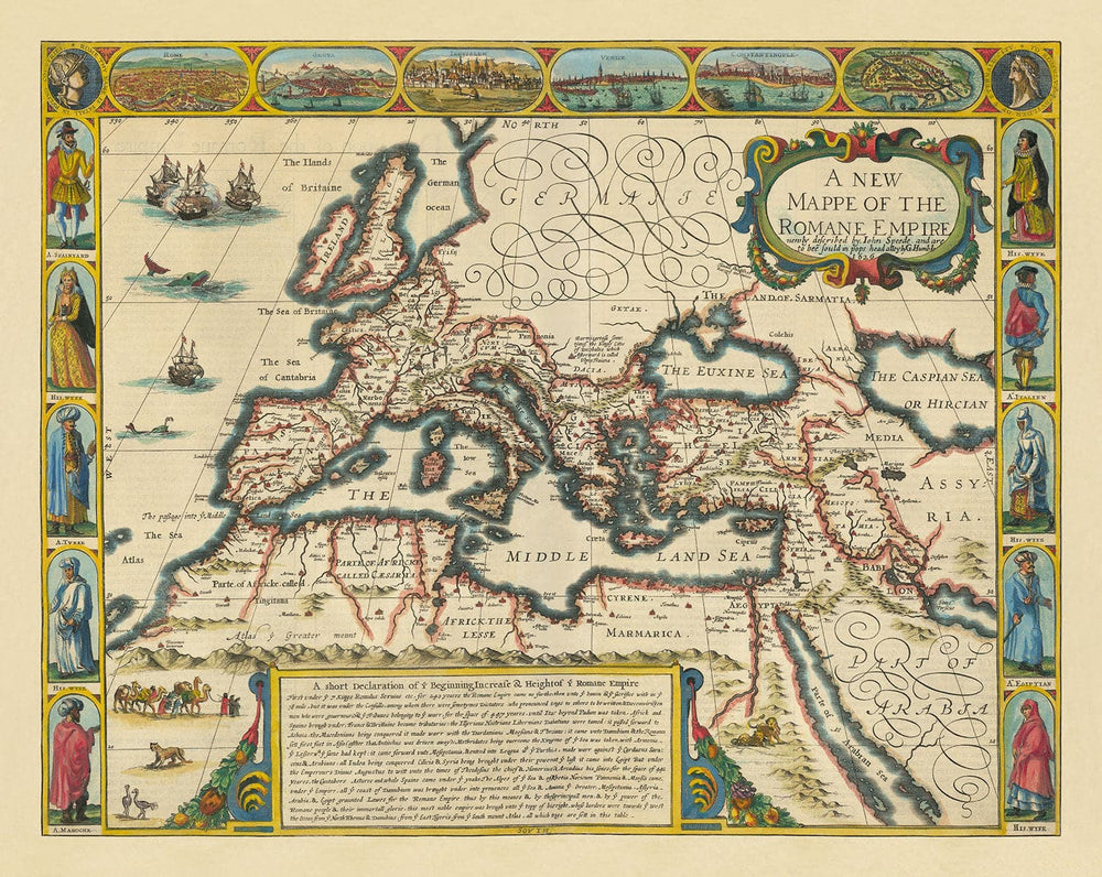 En la parte inferior del mapa hay una 'declaración corta' sobre el comienzo, aumento y apogeo del Imperio Romano - o al menos, hasta donde John Speed lo entendió en 1626.