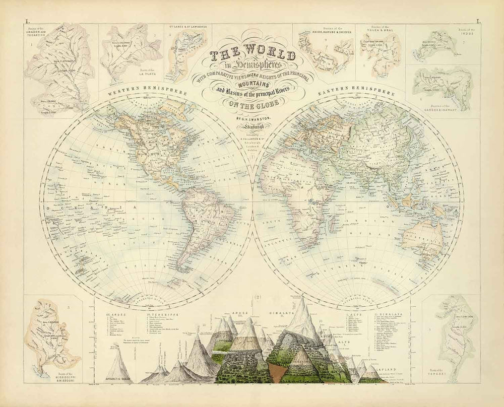 El mapa del mundo está rodeado de hermosos detalles, como ilustraciones de los principales sistemas fluviales del mundo (Amazonas, Volga, Danubio, Misisipi, Misuri, etc.) y también una vista lateral de las cadenas montañosas más grandes del mundo (Himalayas, Andes, Alpes y algunas otras). Curiosamente, el Everest (entonces conocido como pico XV) no se muestra. En su lugar, se muestra el Kangchenjunga como la montaña más alta del mundo, pero más tarde se revisaría a la tercera posición y el Everest sería coronado como el más alto.