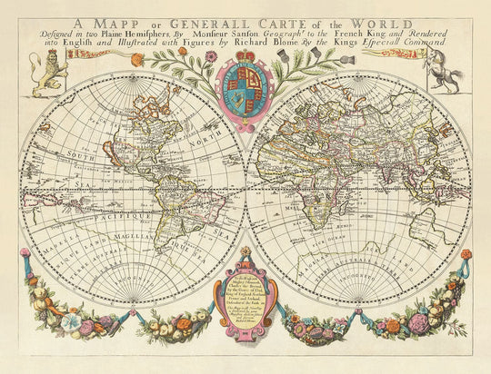 La mayoría de los mapas del mundo de esta era están en el "estilo holandés" con adornos pesados alrededor de los mapas. El mapa de Blome es un poco más escaso ... y bueno, un poco más británico.