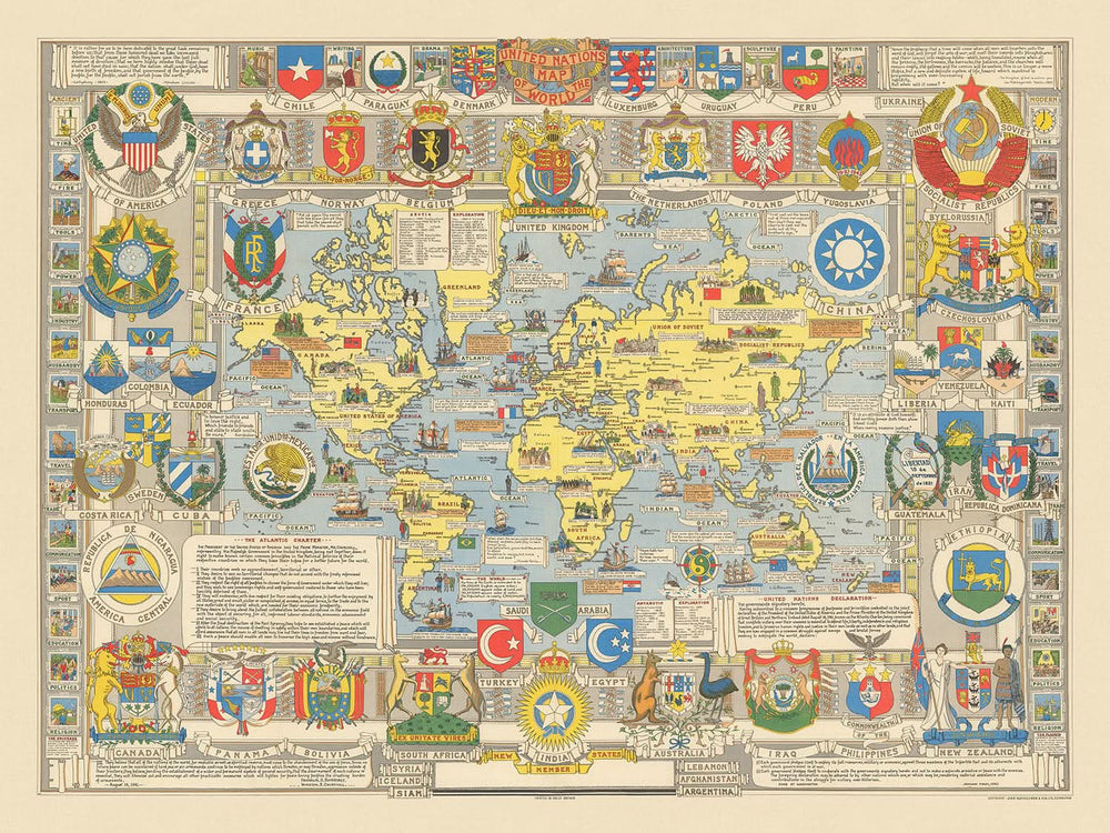 - Creado poco después de la Segunda Guerra Mundial, el mapa refleja el panorama geopolítico de la época y la formación de las Naciones Unidas, simbolizando una nueva era de cooperación internacional.