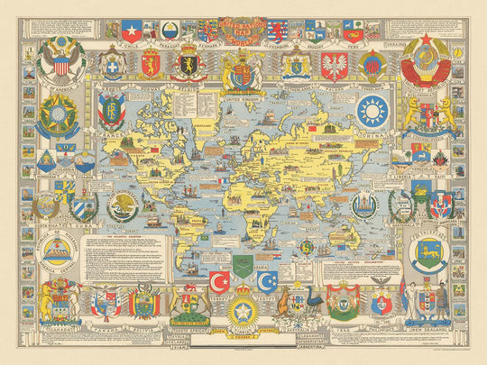 El estilo temático y pictórico del mapa es a la vez atractivo y educativo, y ofrece una ventana al panorama geopolítico de finales de la década de 1940. El borde decorativo del mapa, repleto de emblemas y banderas, actúa como un marco vibrante que atrae la mirada hacia la representación detallada de países y regiones. Este enfoque ilustrativo no solo realza el atractivo visual del mapa, sino que también proporciona una comprensión más profunda de las relaciones y alianzas internacionales de la época.