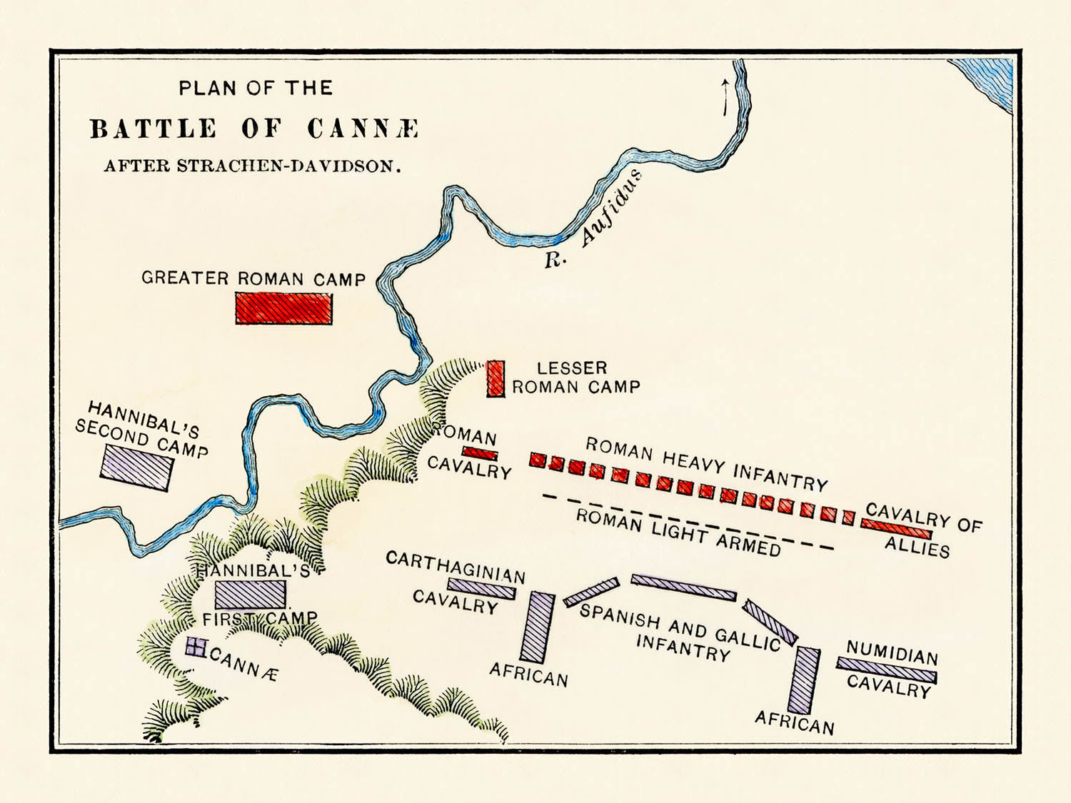 James Strachan-Davidson was a leading British classicist of the late nineteenth century, admired for his lucid scholarship on Rome and his commitment to making ancient history accessible to students and general readers alike. His maps and diagrams, including this plan of Cannae published in 1897, embody that mission: they are concise, meticulously composed, and designed to support clear historical understanding rather than mere decoration.