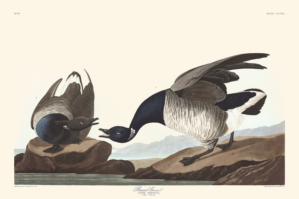 El Ganso Brant (Placa 391), publicado por primera vez en 1827, es una impresionante ilustración de la aclamada serie de John James Audubon, Las Aves de América. Esta notable representación captura la belleza matizada y el comportamiento natural del Ganso Brant, destacando las agudas habilidades de observación y la maestría artística de Audubon.