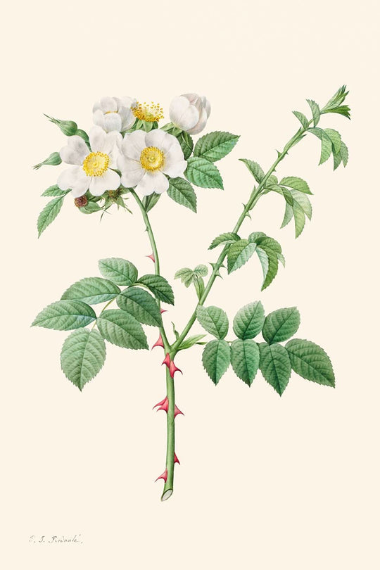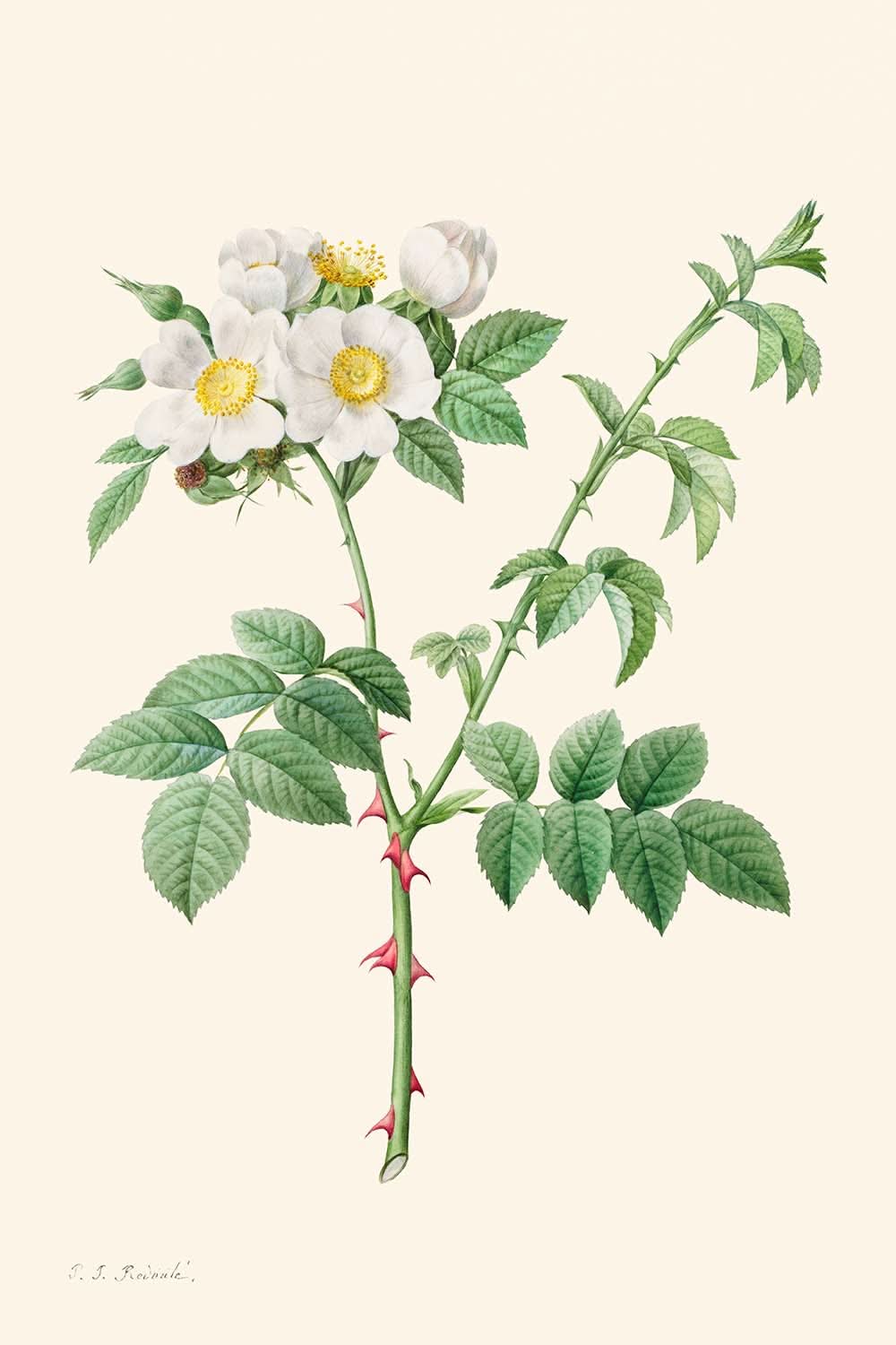 Brier Bush Rose o Dog Rose, publicada por primera vez en 1817, es una impresionante ilustración botánica realizada por el reconocido artista Pierre-Joseph Redouté. Conocido como uno de los mejores ilustradores botánicos de la historia, Redouté dedicó gran parte de su carrera a representar meticulosamente la flora del Château de Malmaison, bajo el patrocinio de Josefina Bonaparte, la estimada esposa de Napoleón.