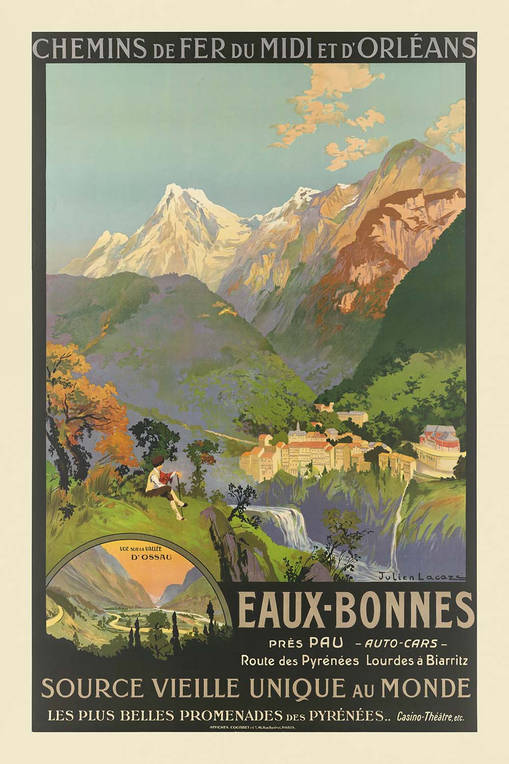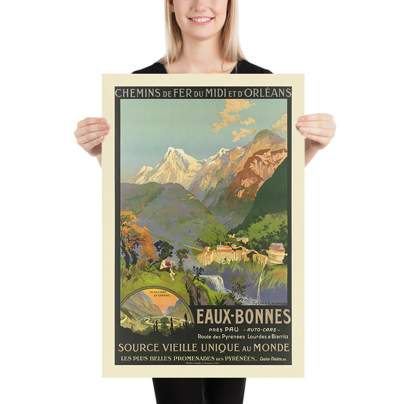 Chemins de fer du Midi et d’Orléans: Eaux-Bonnes – source vieille unique au monde by Julien Lacaze (1910) invites you to the Belle Époque spa town in the French Pyrenees. Created at the height of the golden age of rail travel, this luminous poster promotes Eaux-Bonnes near Pau, famed for its “Source Vieille” thermal spring and mountain promenades. The composition opens onto snow-capped peaks and a sunlit amphitheatre of cliffs, with the grand hotels and casino-theatre perched above waterfalls. In the foreground, a traveler pauses on a grassy ledge, and an inset cartouche clearly labeled “Vue sur la vallée d’Ossau” points toward the region’s celebrated valley—a scene any lover of the Pyrenees will instantly recognize.