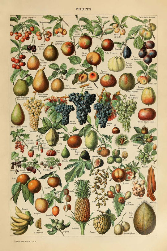 Fruits by Adolphe Millot is a stunning example of Victorian-era botanical illustration, created for the celebrated French encyclopedia "Le Larousse pour tous: nouveau dictionnaire encyclopédique." Produced in 1890, this detailed artwork beautifully displays an array of fruit species with thoughtful French labelling. Millot's encyclopedic illustrations have become iconic, reflecting both scientific accuracy and artistic grace from a period passionately devoted to natural history studies.