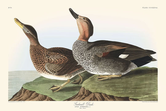 Esta exquisita obra de arte destaca no solo por su belleza sino también por su importancia científica. Conocida científicamente como Anas streperaEl pato friso está representado con una meticulosa atención a los matices de su plumaje y anatomía. La descripción que hace Audubon del hábitat y el comportamiento de la especie realza aún más la intriga, brindando información sobre su entorno natural a lo largo de la costa atlántica y más allá.