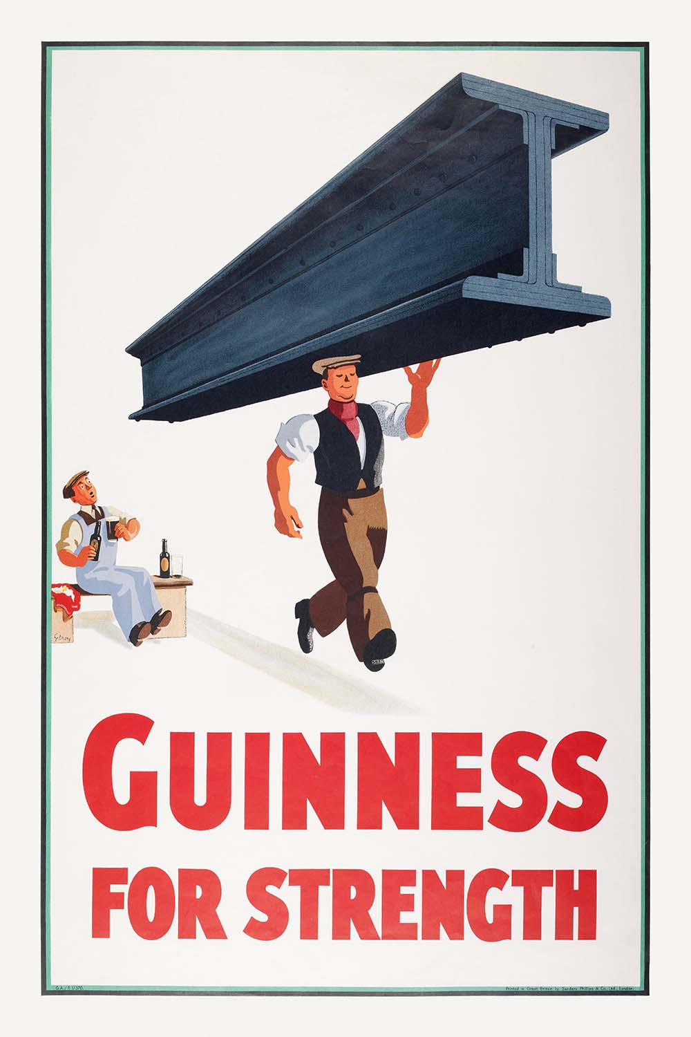 The "Guinness for Strength" poster is renowned for its bold, engaging imagery and instantly recognisable style. The builder’s beaming expression and exaggerated feat of strength, paired with the crisp, blocky lettering of the slogan, create a composition that is both visually striking and delightfully whimsical. The poster’s enduring appeal lies in its ability to evoke nostalgia while remaining fresh and relevant—a testament to Gilroy’s masterful design sensibility.