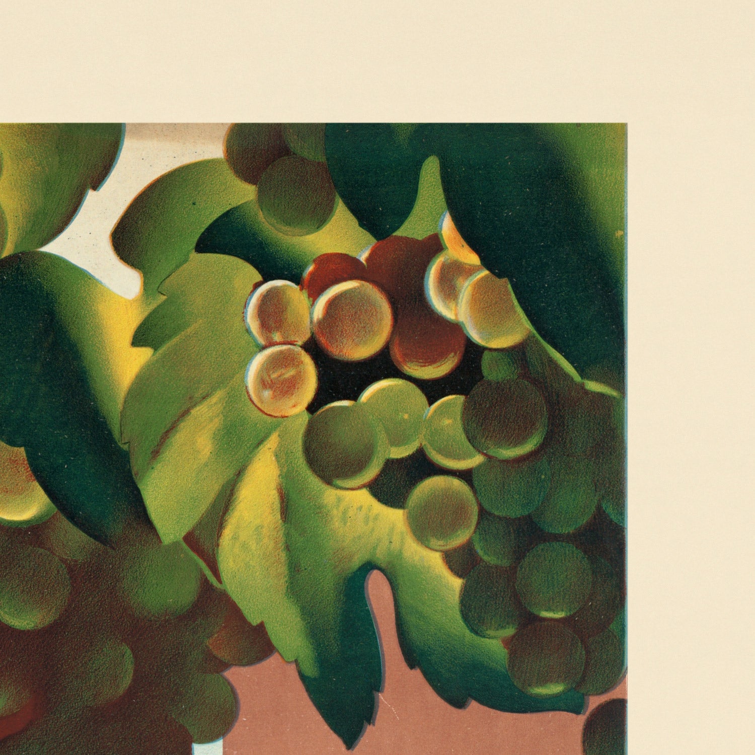 Color and design are where the piece truly shines. Dominant soft blues and fresh, saturated greens are energized by accents of burgundy and warm brown, creating a crisp cool–warm contrast that draws the eye. The naturalistic grape motif—an ode to Vitis vinifera—symbolizes fertility and abundance, while the geometric stylization of figures and architecture adds a precise, contemporary edge. Smooth, refined strokes and sharply cut forms lend it a clarity that reads beautifully from across a room. Whether hung in a kitchen, dining room, bar, or study, it’s a striking conversation piece that pairs effortlessly with modern, mid‑century, and transitional interiors.