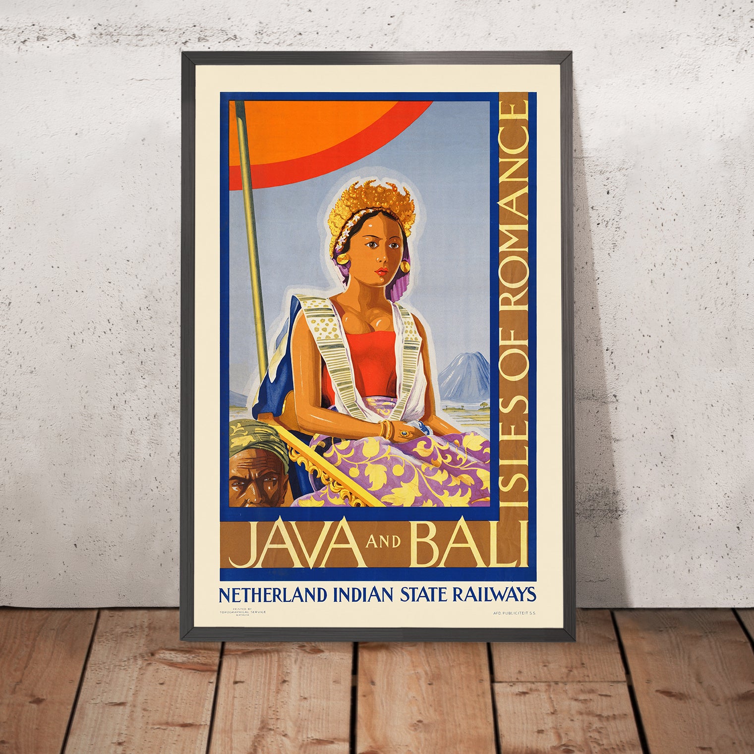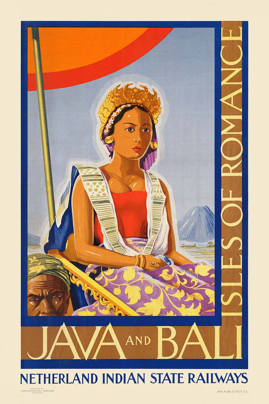 About the subject: Java and Bali have long captured the imaginations of travelers with their dramatic volcanoes and terraced landscapes, temple silhouettes, and renowned performing arts traditions. In its own time, a poster like this would have hung in European booking offices and ship terminals, promising ocean‑liner romance and island mystery. Today it stands as both a beautiful artifact of early tourism and a reminder of the era’s persuasive imagery and the colonial gaze it embodied.