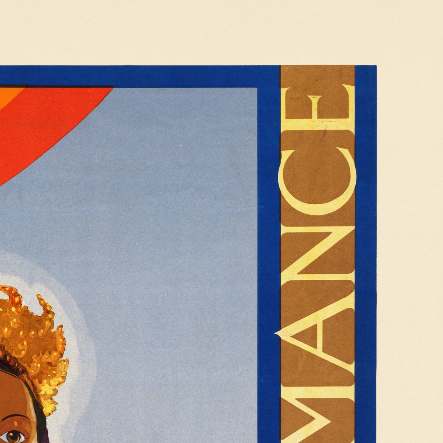 “Java and Bali. Isles of Romance” is a classic Art Deco travel poster created to entice European visitors to the Dutch East Indies—today’s Indonesia. The artist’s name is lost to history, as was common for studio illustrators who worked anonymously on commission for shipping lines and tourist bureaus. With its glamorous geometry, streamlined forms, and alluring palette, the poster presents an idealized vision of Java and Bali, celebrating tropical warmth and ceremonial grace while reflecting the complex, colonial-era marketing that shaped early twentieth‑century travel.