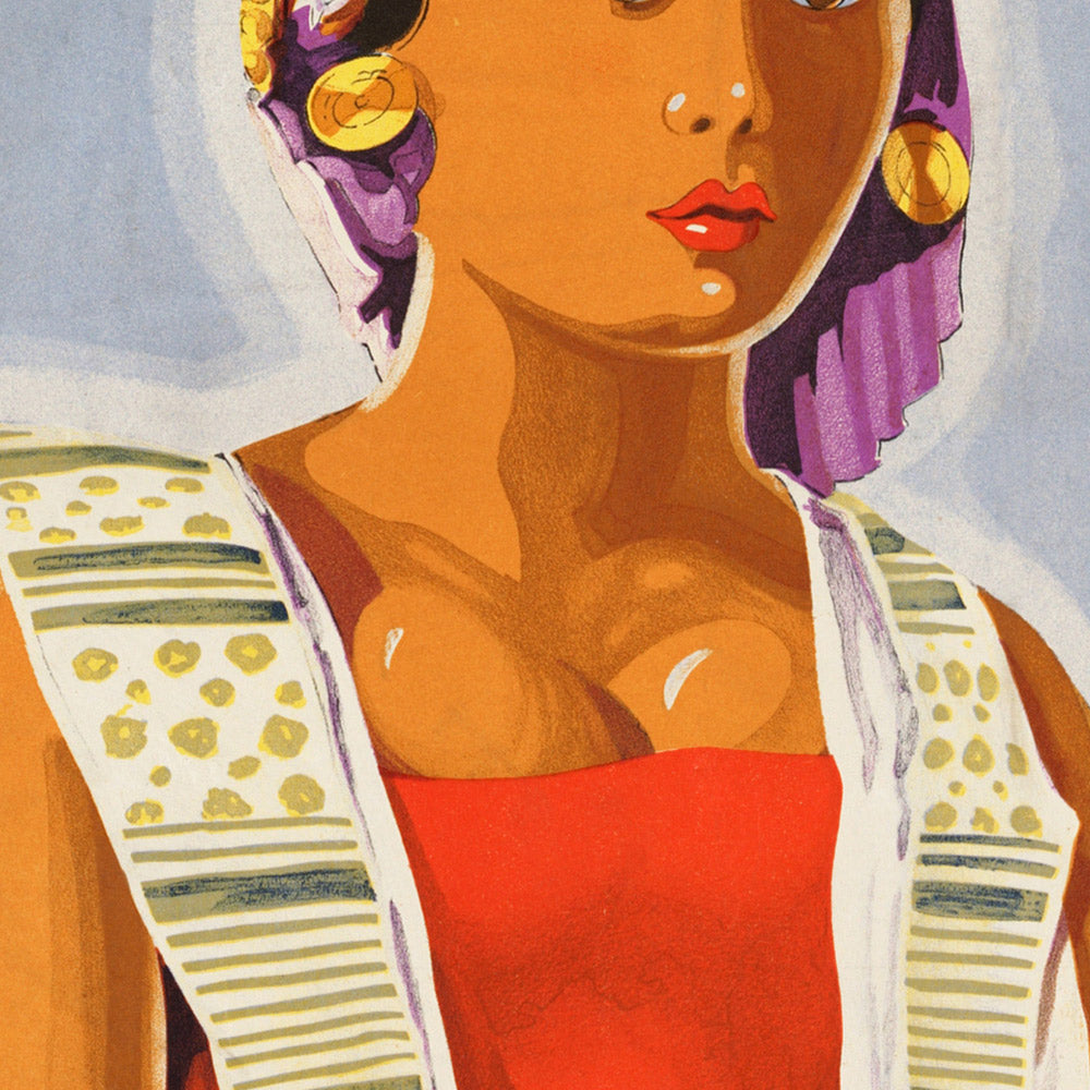About the design: The composition marries crisp, modern lettering with flowing ornament and costume details that suggest batik-inspired patterning. Saturated reds and golden yellows glow against richer purples and deep tonal accents, evoking heat, dusk, and festival light. Smooth, flat color planes and clean contours heighten the Art Deco drama, while the inventive title typography anchors the piece with chic authority. It’s a striking statement for interiors—especially alongside rattan or teak, black gallery frames, or mid‑century silhouettes—and a potent color story that enlivens hallways, living rooms, and creative studios alike.