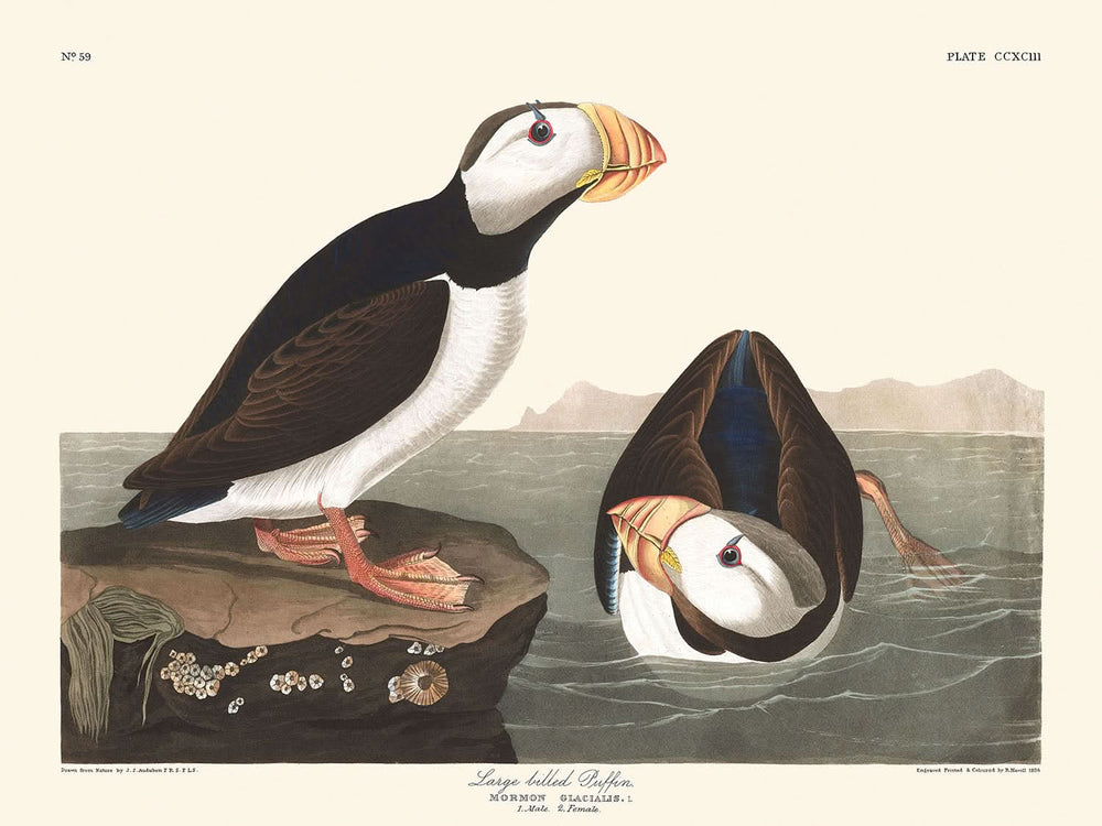 El frailecillo de pico grande no solo es notable por la precisión de los detalles de Audubon, sino también por ser un ave fascinante debido a su naturaleza esquiva. El propio Audubon registró solo un posible avistamiento de esta especie, lo que resalta su rareza. Su representación está basada en una colaboración con colegas ornitólogos, lo que fundamenta su trabajo en la autenticidad tanto artística como científica. Esta mezcla de narrativa y arte visual proporciona una historia encantadora que enriquece cualquier colección de arte.