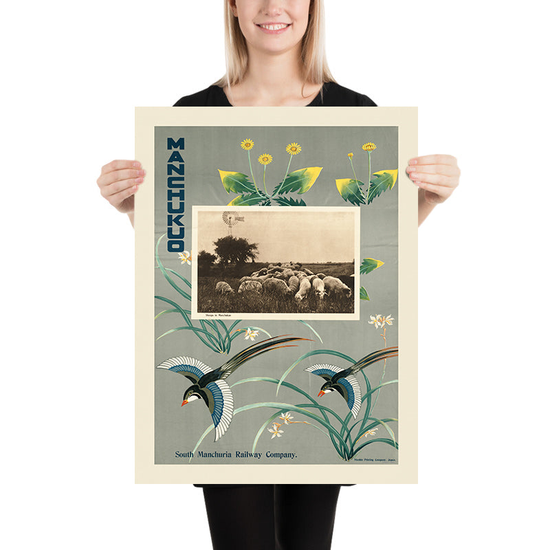 Design and color to love: The composition deftly contrasts a rectangular, sepia photograph with fluid, organic shapes—arching stems, fluttering birds, and floral motifs. A palette led by rich greens, radiant yellows, and deep blues (softened by elegant greys) produces a calm yet confident visual rhythm. Clean, Deco-inspired lines and the bold typography of “MANCHUKUO” and “South Manchuria Railway Company” enhance the poster’s modernity and collectible appeal. Hung in a living room, study, or hallway, it becomes a conversation piece—equally at home in vintage-inspired interiors or minimalist spaces that welcome a touch of history and color.