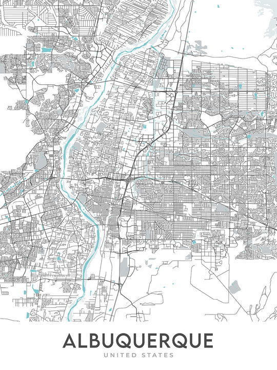 Mapa moderno de la ciudad de Albuquerque, NM: centro, casco antiguo, Universidad de Nuevo México, montañas Sandia, Río Grande