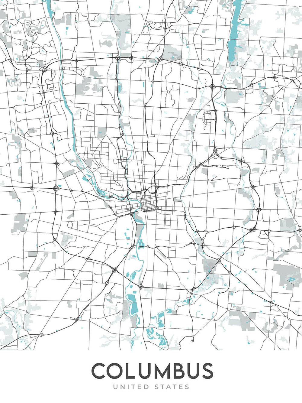 Este mapa de Columbus, Ohio, es un mapa moderno y detallado de las calles sin etiquetas. Se centra en la ciudad de Columbus y sus áreas circundantes, proporcionando una representación precisa y visualmente atractiva de la región. El mapa cubre un área rectangular de aproximadamente 25 millas por 21 millas, con la ciudad de Columbus en su centro.