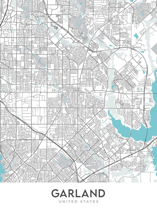 Este mapa de Garland, Texas, es un callejero moderno y detallado sin etiquetas, perfecto para quienes desean una obra de arte elegante e informativa para su hogar u oficina. El mapa cubre un área rectangular que mide aproximadamente 10,6 millas de alto por 9 millas de ancho, con el centro del mapa ubicado en las coordenadas exactas 32.91464N, -96.63207W. El mapa se centra en la ciudad de Garland e incluye muchos de sus vecindarios más notables, incluidos Buckingham, Duck Creek, Firewheel, Glenbrook Valley, Granville Arts District, Kingsley, Lake Highlands, Lavon, M Streets, North Garland, Oak Cliff, Old. Town, Park Central, Ridgewood Park, Saturn Road, Spring Park, The Waterfront, Timberbrook, Valley Creek y Walnut Creek.