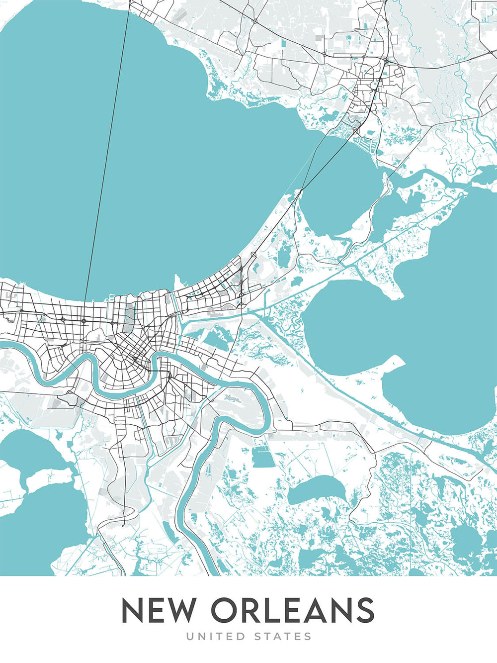 Este mapa de Nueva Orleans, Luisiana, es un callejero moderno y detallado sin etiquetas. Se centra en la ciudad de Nueva Orleans y sus alrededores, proporcionando una representación precisa y visualmente atractiva del diseño de la ciudad. El mapa cubre una amplia gama de vecindarios, incluido el histórico Barrio Francés, el Distrito Central de Negocios, el Distrito Garden, Metairie, Argel, Treme, Bywater, Marigny, Faubourg St. John y Gentilly.