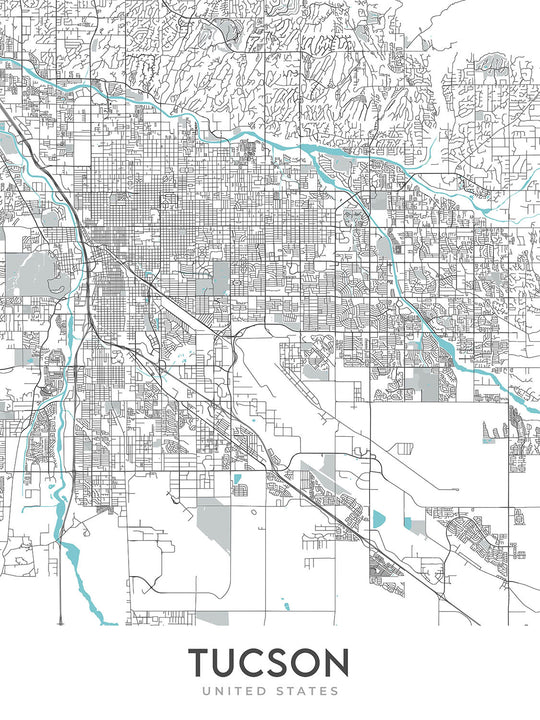 Este mapa de Tucson, Arizona, es un mapa moderno y detallado de las calles sin etiquetas. Se centra en la ciudad de Tucson y la región circundante, proporcionando una visión general completa del área. El mapa cubre una amplia gama de vecindarios, incluyendo Menlo Park, Blenman-Elm, Feldman's, El Presidio, Barrio Santa Rosa, Armory Park, West University, Sam Hughes, North University Park, Jefferson Park, Downtown, Barrio Anita, Barrio Hollywood, Barrio Libre, South Tucson, Barrio Historico, Barrio Viejo, Barrio Centro, Barrio Menlo Park, Barrio Santa Rita y Barrio San Antonio.