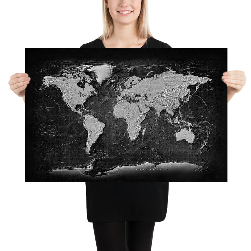 Industrial Style World Map by Ray&Co is a contemporary cartographic tour de force: a global portrait that fuses precise political boundaries with finely rendered physical geography. True to the studio’s reputation for marrying aesthetics and utility, the map sets a monochromatic, industrial palette against exquisitely crisp country outlines and meticulously labeled major cities. Across the world’s oceans, a raised 3D bathymetric texture adds visual depth and a sense of motion, drawing the eye from continental shelves to abyssal plains. This is a map designed to be read and admired—an elegant synthesis where clarity, restraint, and information density coexist, and where the present-day geopolitical landscape is framed within an arresting, modern design language.