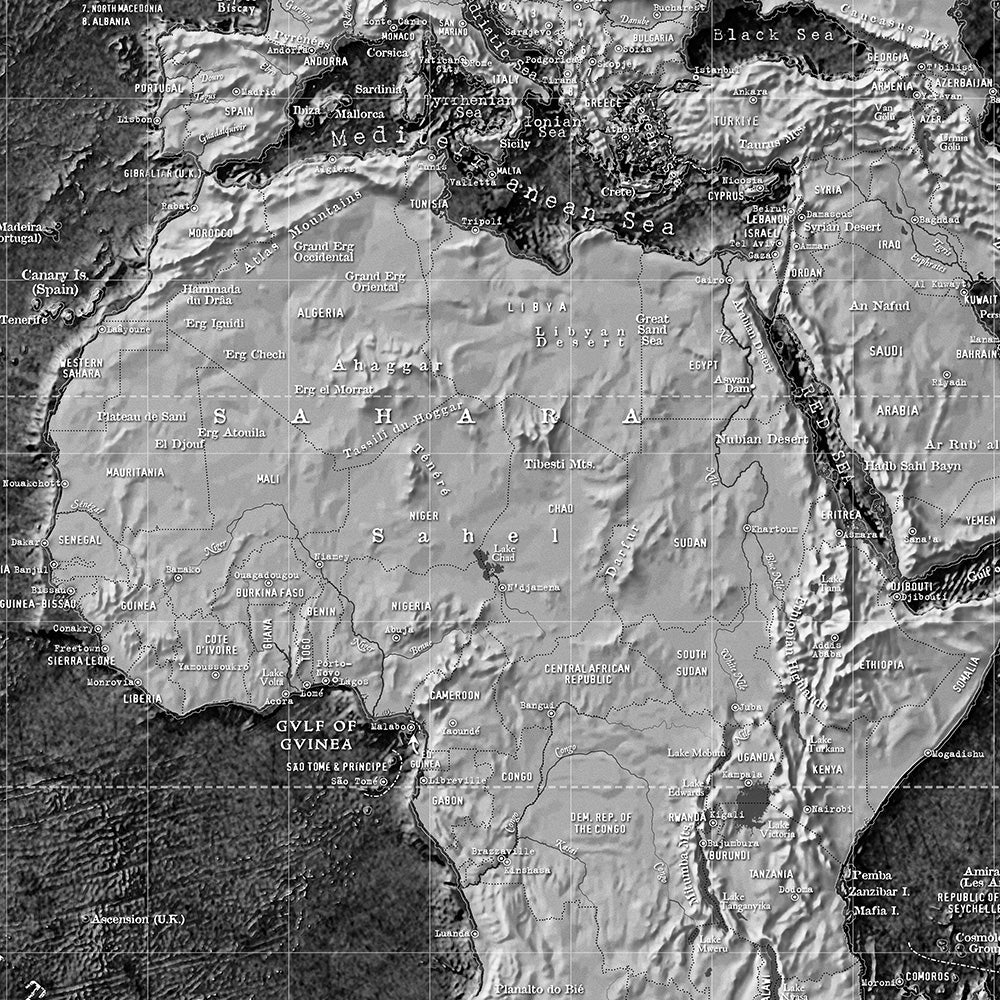 Physical geography receives equal prominence, delivered with an editorial intelligence that avoids clutter. Major rivers weave across the continents in clean, purposeful lines, emphasizing the hydrographic skeleton that underpins human settlement. Noteworthy features such as the Plateau of Tibet, the Alps, and the West Siberian Plain are called out with unobtrusive labels that sit comfortably within the monochrome field. Mountain ranges remain deliberately unnamed, a design choice that grants the relief shading and landforms room to breathe. Beneath the world’s oceans, the 3D-rendered bathymetry captures trenches, ridges, and continental margins with sculptural subtlety, inviting extended study.