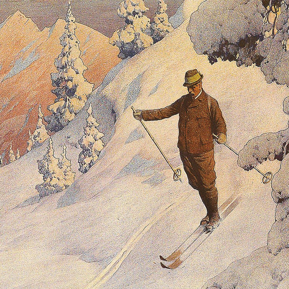 Murtal-Bahn by Gustav Jahn is a vintage Austrian travel poster celebrating the alpine beauty of the Mur Valley and the railway that opened it to winter adventure. Jahn, the celebrated Viennese landscape painter, poster artist, and mountaineer, brought firsthand experience of high mountains to his work. Trained at the Academy of Fine Arts and active with the Österreichischer Alpenklub, he became widely known for his striking series created for the Imperial Royal Austrian State Railways—posters that helped popularize skiing and alpine tourism across Austria.
