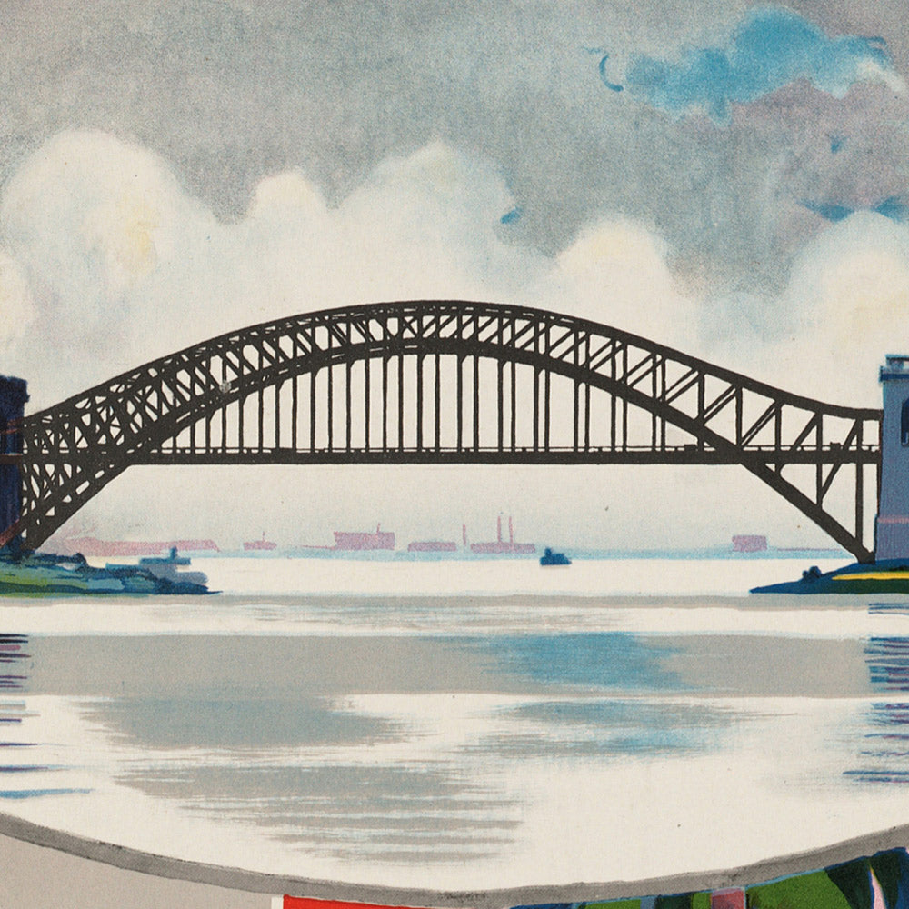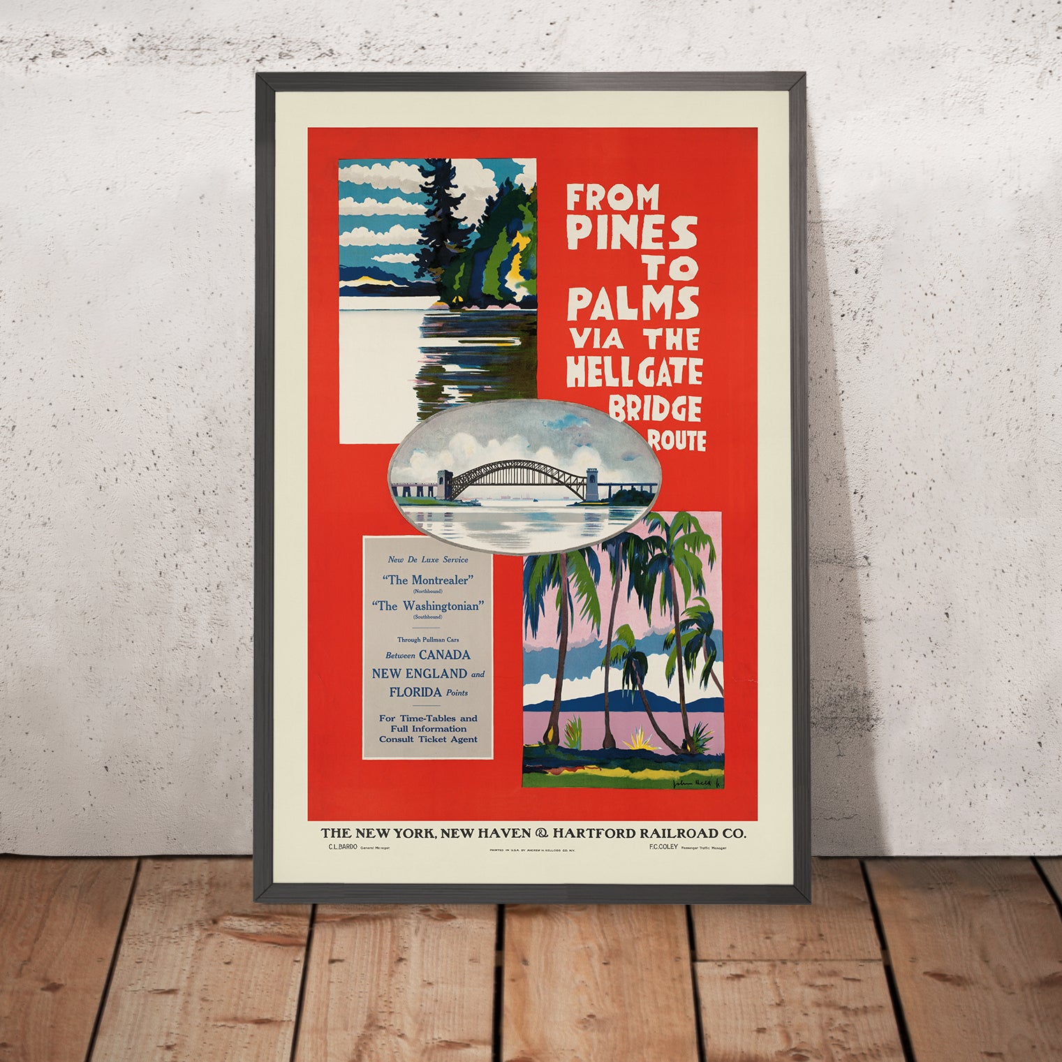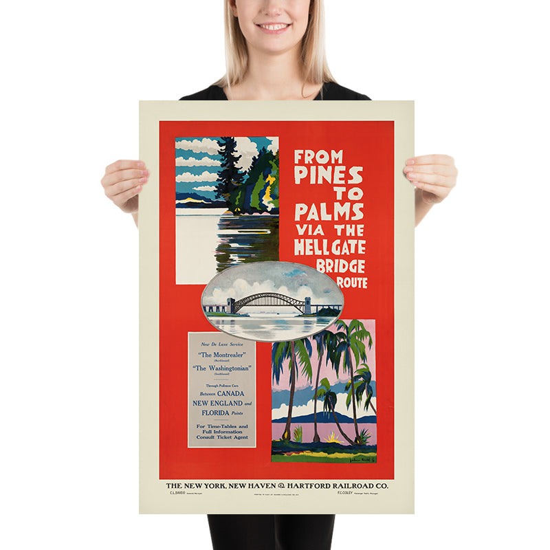 The subject here is historically significant: the Hell Gate Bridge, completed in 1917, provided the crucial rail link that joined New England to the nation’s southern routes. The poster’s small timetable panel even touts “The Montrealer” and “The Washingtonian,” emblematic of the through Pullman service that stitched together Canada, New England, and Florida. For travelers and rail enthusiasts alike, this image celebrates the moment when a single crossing in New York made seamless north–south journeys possible.