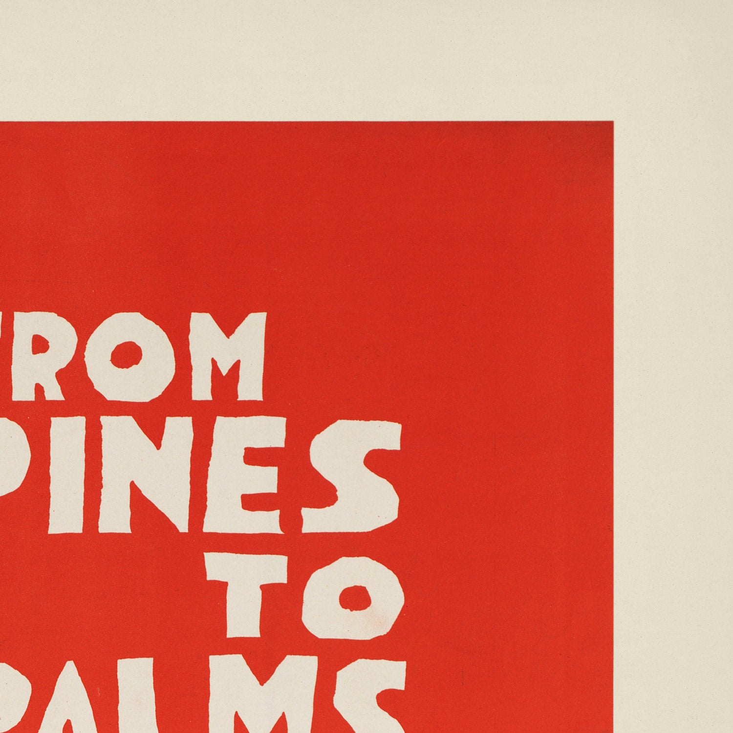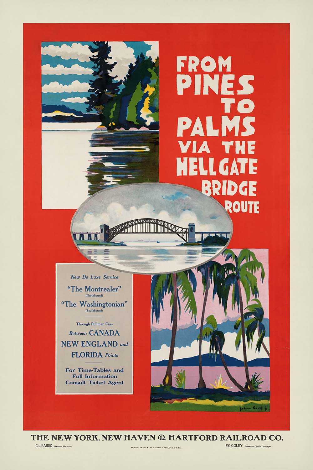 From Pines to Palms via the Hell Gate Bridge Route by John Held Jr. (1924) captures the romance of rail travel along America’s Atlantic seaboard. Commissioned for the New York, New Haven & Hartford Railroad, the poster invites you to sweep from New England’s cool lakes and evergreen shores to the sunlit beaches of Florida—linked through New York City’s Hell Gate Bridge. Held arranges three vivid scenes on a coral-red field: a pine-framed lake at the top, an oval cameo of the steel-arched Hell Gate Bridge at center, and a moonlit grove of palms beside blue water at the bottom. The stacked, chunky white lettering—“From Pines to Palms via the Hell Gate Bridge Route”—is pure Jazz Age bravado and instantly evokes the speed, style, and optimism of 1920s travel.