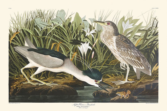 La garza nocturna, o pájaro de Qua, pintada por el prestigioso John James Audubon en 1827, es una ilustración magistral de su colección de renombre mundial, Birds of America. Las obras de Audubon son famosas por su intrincado detalle y representación realista de especies de aves, lo que las convierte en algunas de las piezas de arte más preciadas de la historia natural.