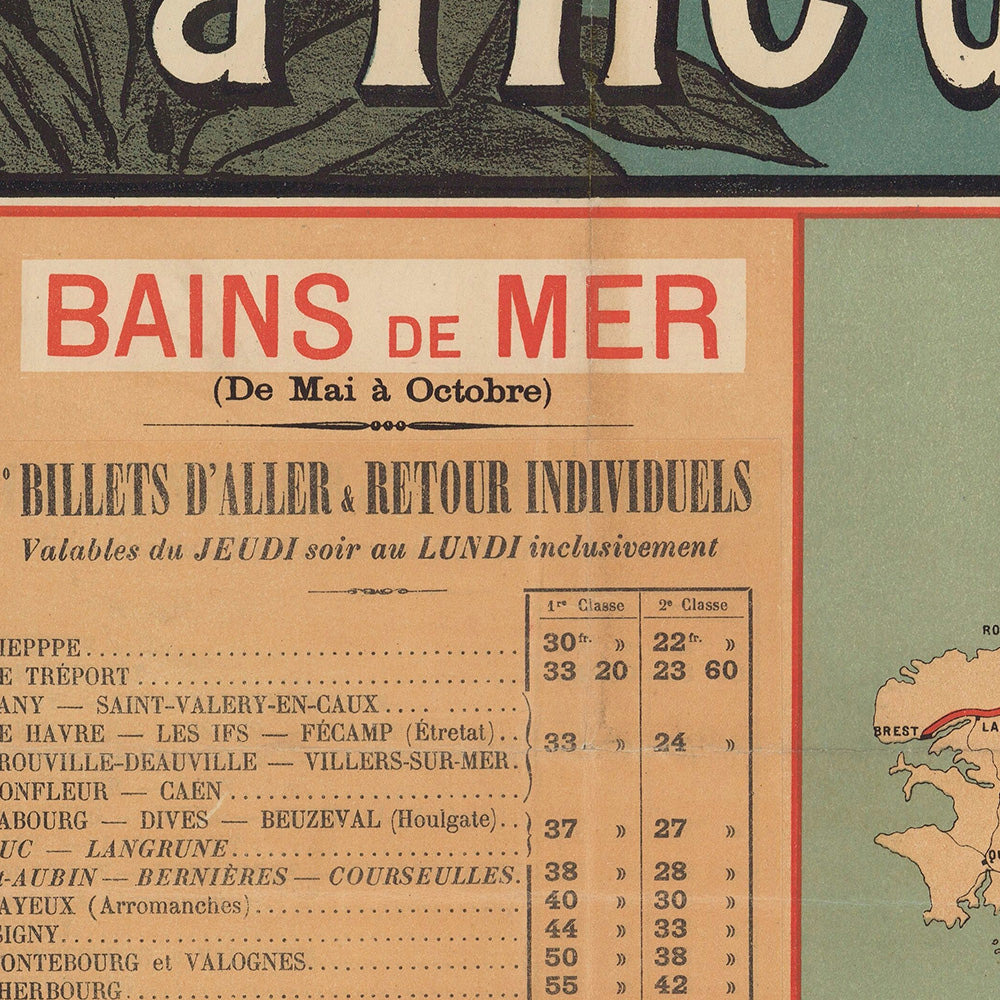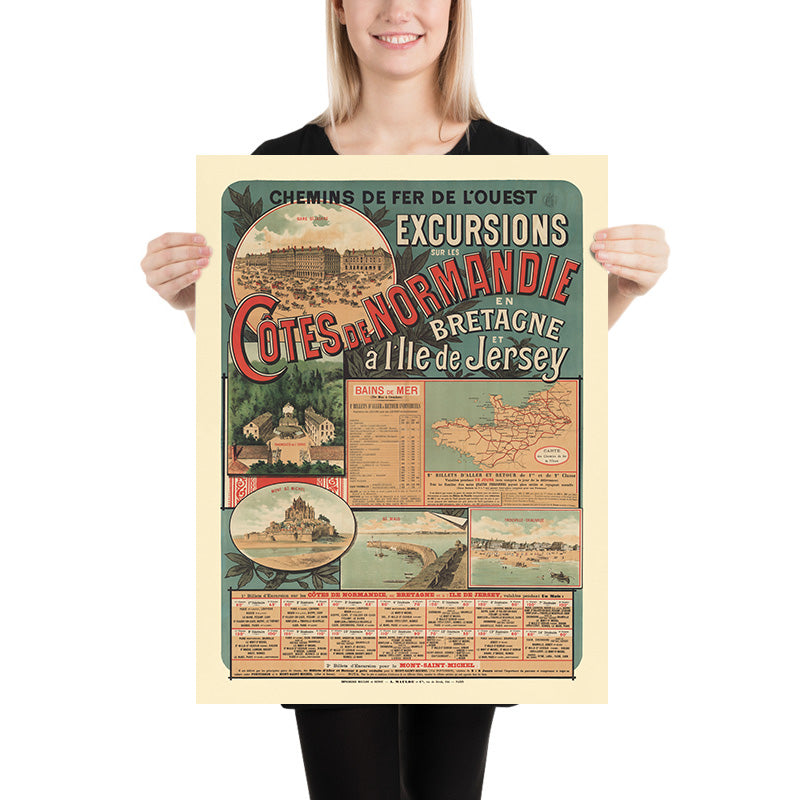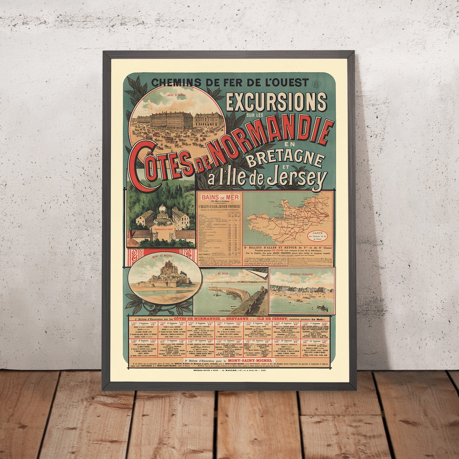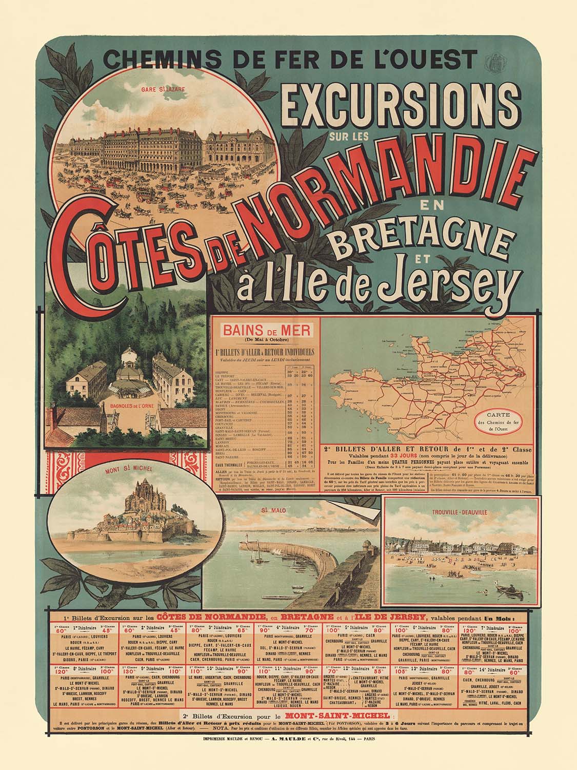 Chemins de Fer de l’Ouest. Excursions sur les Côtes de Normandie by Imp. Maulde et Renou (1890) captures the golden age of French rail travel with a vivid invitation to the sea. Produced in Paris at the height of the Belle Époque, this original railway poster promotes seaside excursions from the capital to Normandy’s celebrated coast (with extensions into Brittany and the island of Jersey). A sweeping diagonal title in red, shaded type cuts across a sea-green ground, while cameo views present the very destinations travelers dreamed of: the grand concourse of Gare Saint‑Lazare at top left, dune-backed beaches at Trouville–Deauville, the curved harbor wall of Saint‑Malo, the spa at Bagnoles‑de‑l’Orne, and the incomparable silhouette of Mont‑Saint‑Michel. A small network map and “Bains de Mer” fare tables complete the promise of effortless escape.