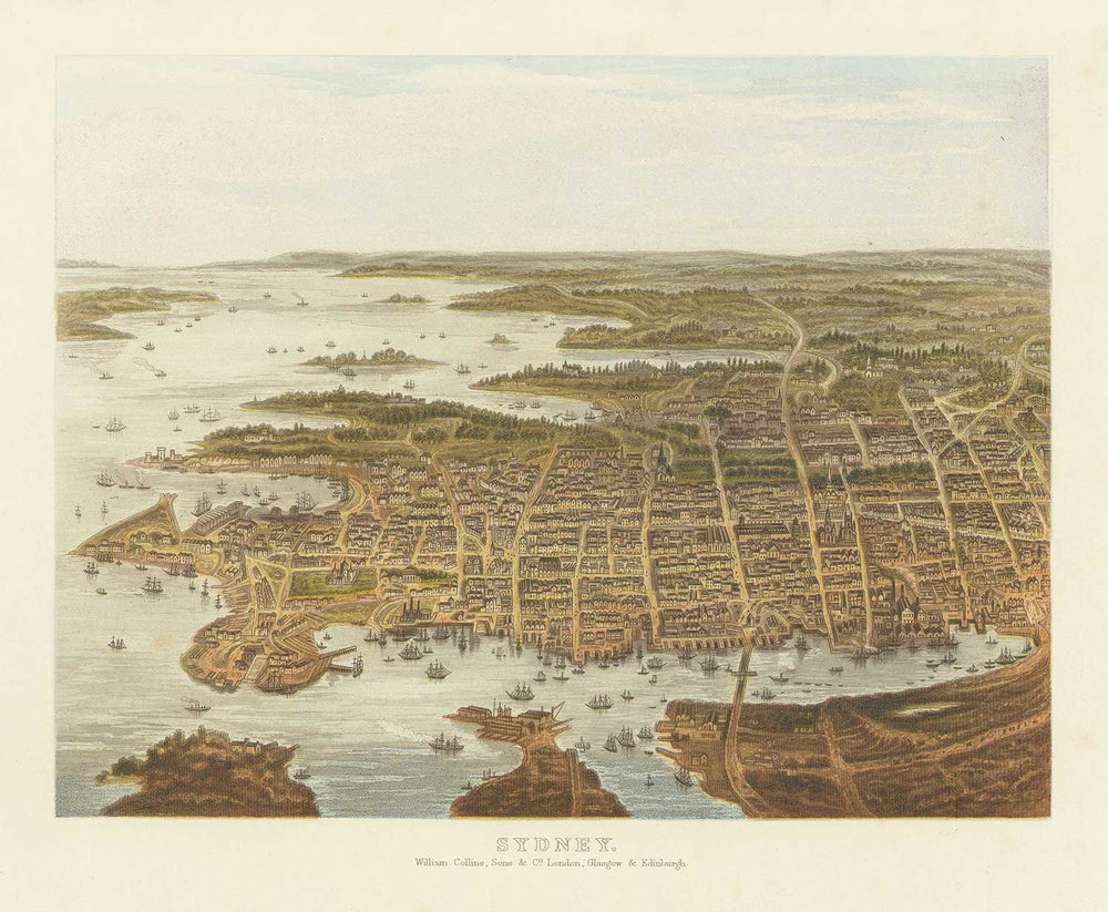 Vista antigua de Sydney a ojo de pájaro en 1875 por William Collins: Nueva Gales del Sur, St George, Sutherland Shire, Sur, Inner West