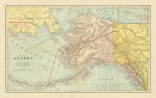 El mapa muestra a todos de Alaska en excelentes detalles, incluido el conjunto completo de islas Aleutianas. Se muestran partes del Yukon (Noroeste de Canadá), centrándose en la región de Klondike. Siberia oriental y el estrecho de Bering también se pueden ver claramente. Ríos, montañas y asentamientos están claramente marcados. ¡En particular, Anchorage no se resolvería hasta 1912, ¡así que no está en este mapa!