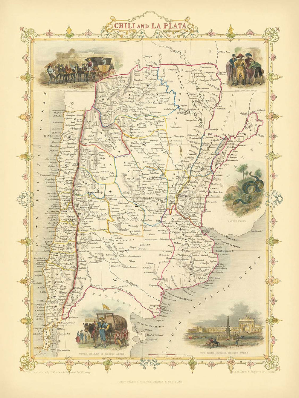 El mapa de Tallis está adornado con cautivadoras viñetas que ofrecen una ventana a la vida y los tiempos de las regiones que retrata. Desde la bulliciosa Plaza Mayor en Buenos Aires hasta la representación de una posta viajera, estas ilustraciones enriquecen el mapa con contexto cultural e histórico. La presencia de un "Gobernador" regional y una serpiente de cascabel añade capas de intriga, invitando a los espectadores a reflexionar sobre las historias detrás de estos símbolos. Tales embellecimientos artísticos fueron una característica distintiva del trabajo de Tallis, haciendo que sus mapas no solo sean informativos, sino también visualmente atractivos.
