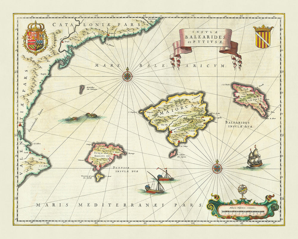 El mapa de Blaeu de las Islas Baleares es una hermosa y detallada obra de arte. Es un mapa político y físico, y muestra las islas de Mallorca, Menorca e Ibiza, así como la costa catalana contigua. El mapa está lleno de características interesantes, incluyendo monstruos marinos, barcos, escudos de armas reales y un elegante rollo de título.