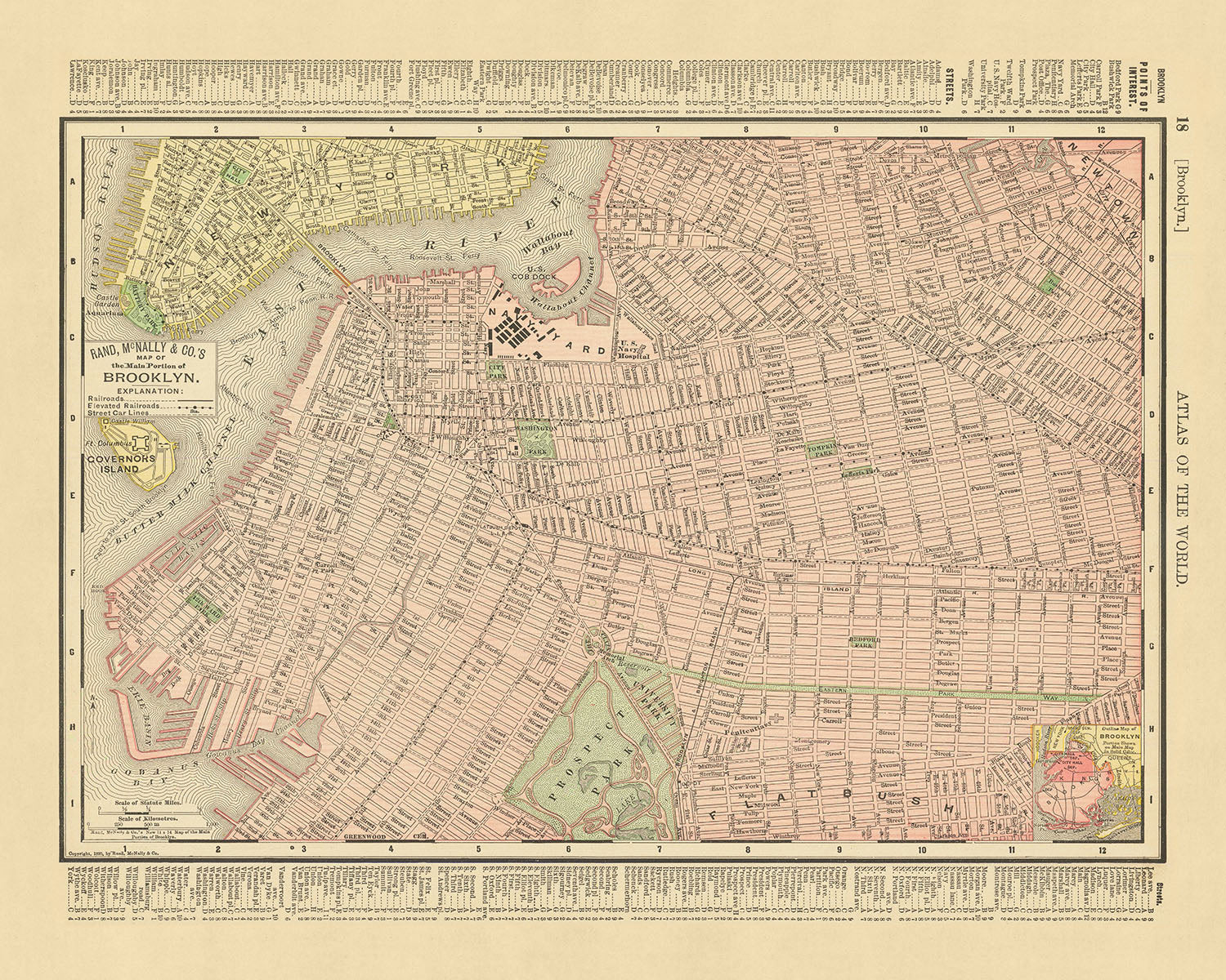 Este mapa sirve como un fascinante documento histórico, trazando la evolución de la topografía urbana de Brooklyn. Los cartógrafos de Rand McNally han detallado intrincadamente los diseños de calles y los hitos arquitectónicos de la época, presentando un rico tapiz de la vida urbana de Brooklyn a principios del siglo. De particular interés es la representación de Fort Greene Park, entonces conocido como Washington Park, antes de su transformación por los célebres arquitectos paisajistas, Olmsted y Vaux. El mapa también delimita la frontera noreste de Brooklyn con Newtown, una antigua ciudad que ahora abarca muchos vecindarios de Queens, incluyendo el actual Ridgewood.